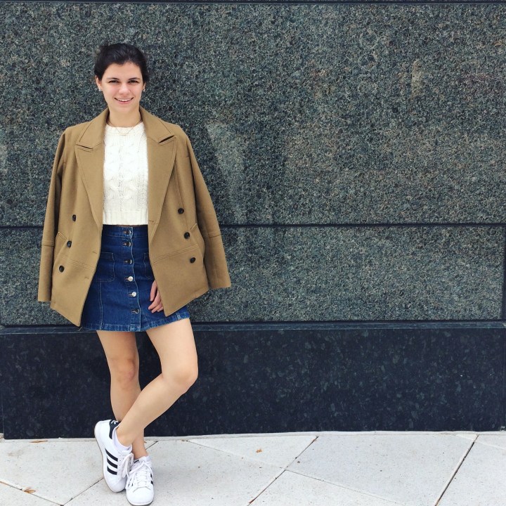 I originally planned to pair this denim button-up skirt with a denim jacket, with the Adidas Originals and the cropped white sweater to break up the all-denim aesthetic. The denim jacket was a tight fit over the bulky sweater, however, so I settled on this camel coat instead. I love the shape of this coat—it’s swingy without being boxy, and the wide lapels make my inner 80s prep happy.