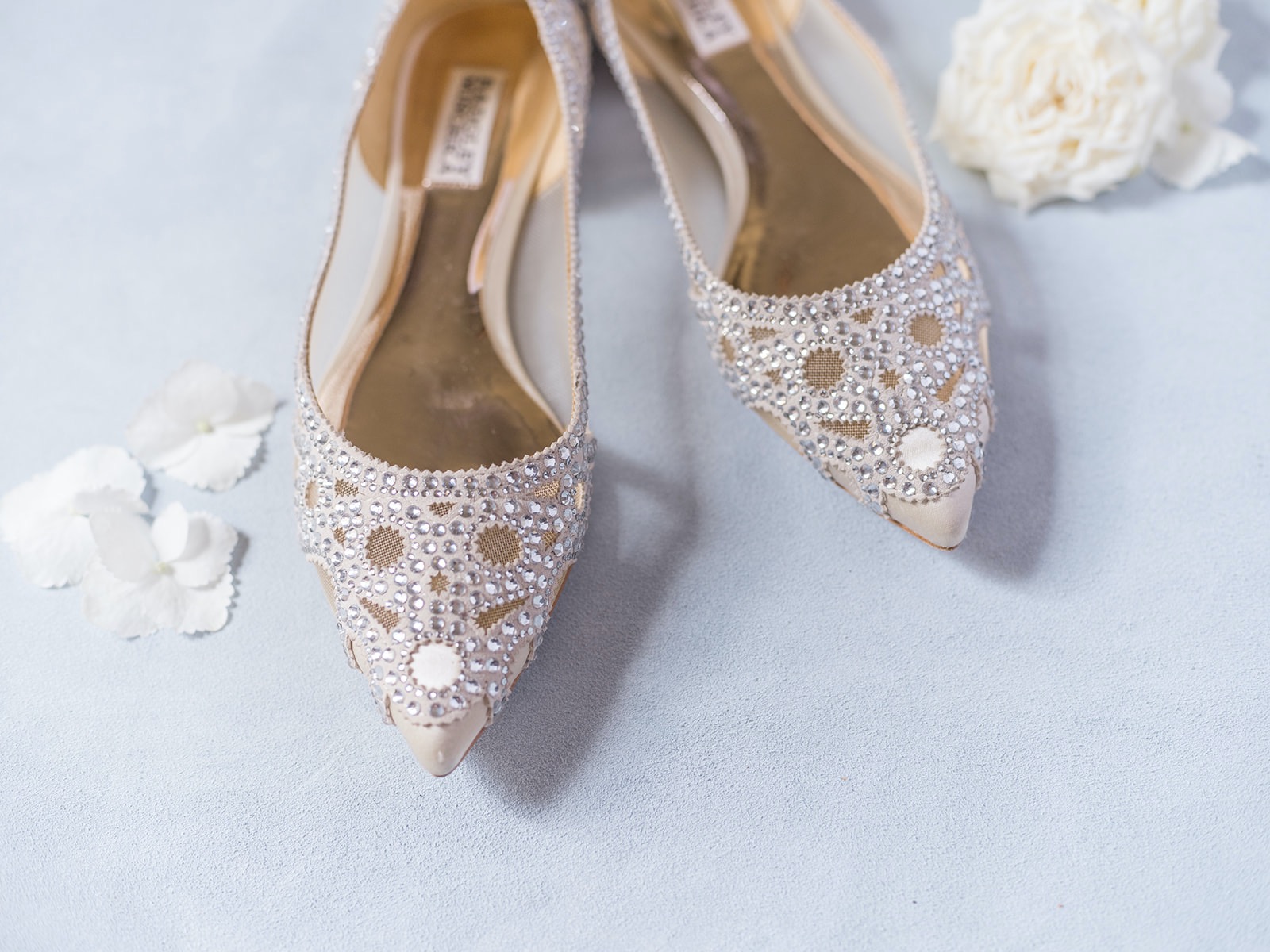 My mom and the maid of honor helped me into my underskirt and gown and adjusted at least fifty combined layers of tulle, and I tracked down my shoes and accessories, which had migrated around the room as the photographers took styled pictures of them. I had two pairs of shoes: a pair of pointy Badgley Mischka flats for the ceremony, which were light pink silk with rhinestone embellishments (initially I thought the sparkle would be distracting, but they were actually very understated, and I knew they would be hidden under my dress), and a pair of pink satin ballet flats for dancing at the reception.
